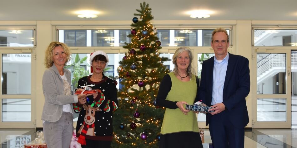 Am Weihnachtswunschbaum im Eingangsbereich des gemeinsam genutzten Gebäudes an der Jagenbergstraße 1 hatten 130 Karten mit Wünschen der Bewohner des Herz-Jesu-Pflegeheims und der Neusser Lebenshilfe gehangen. Diese Wunschkarten konnten sich die Mitarbeiterinnen und Mitarbeiter während der Adventswochen vom Baum „pflücken“ und in weihnachtlich verpackte Geschenke umwandeln. Am 18. Dezember 2024 nahmen die Repräsentantinnen des Herz-Jesu-Pflegeheims und der Neusser Lebenshilfe die Geschenke entgegen.